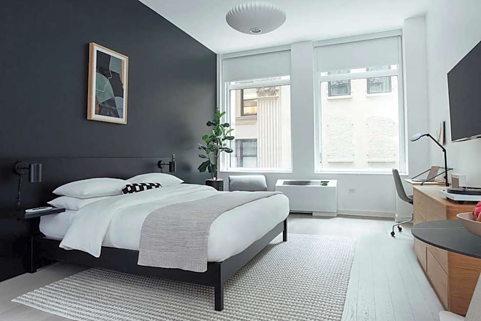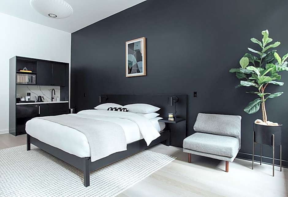 This studio features a fully-equipped kitchen and dining space.